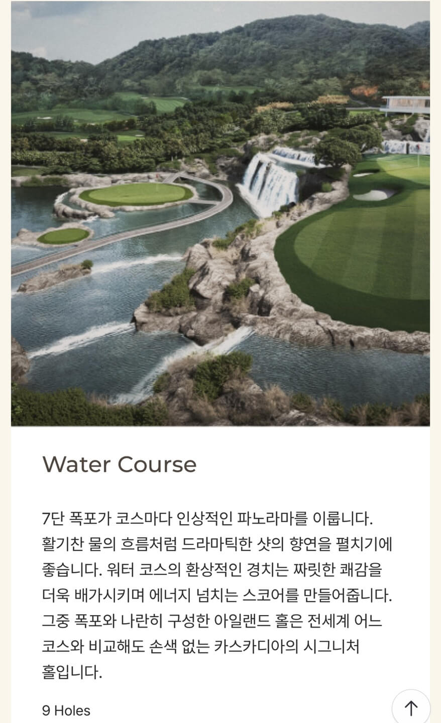 워터코코스 7단폭포가 코스마다 인상적으로 특히 워터코스의 마지막 9홀은 아일랜드홀이라고 불리며,기네스 등제 예정인 환상적인 5단 폭포와 결경을 이룹니다.