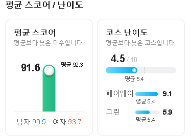 코스난의도 남자 평균 90, 5 여자평균 93.7 개로 평균보다는 코스난이도가 낮으나 코스마다 포토존과 풍경을 만끽하면서 즐길 수 있습니다.